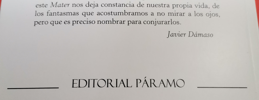 Tras unas fechas reivindicativas, emotivas e históricas, con comuneros y cadenas al cuello, cambiamos de género y presentamos Mater, el último poemario de Pilar Salamanca. Como dice en el prólogo de esta obra el también poeta Javier Dámaso: "La poesía de Pilar Salamanca es siempre certera, aguda como un dardo. Cada uno de sus libros de poemas descansa sobre sus propios basamentos, tiene una voz singular, nunca idéntica a los otros. Aquí la poesía aparece como revelación, como iluminación profana, como mirada que muestra el mundo, como palabra que alumbra. Es así como este Mater nos deja constancia de nuestra propia vida, de los fantasmas que acostumbramos a no mirar a los ojos, pero que es preciso nombrar para conjurarlos."